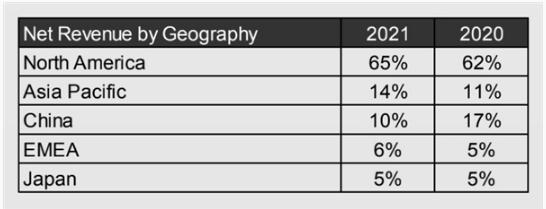 而來自亞太地區,中國、EMEA(歐洲、中東和非洲)和日本的收入分別占總凈收入的 14%、10%、6% 和5%。其中來自中國的營收比持續下降,這也能從側面看出蘋果等北美公司吃掉了過去華為的部分訂單需求從而帶來的影響。