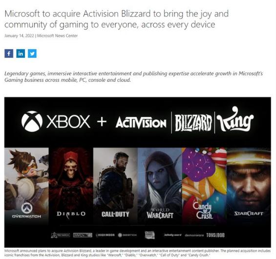 1 月 18 日,微軟公司宣布計劃收購游戲開發和互動娛樂內容發行商動視暴雪公司。據其官網公告顯示,此次收購將加速微軟游戲業務在移動、PC、游戲機和云領域的增長,并將為搭建元宇宙提供基礎。