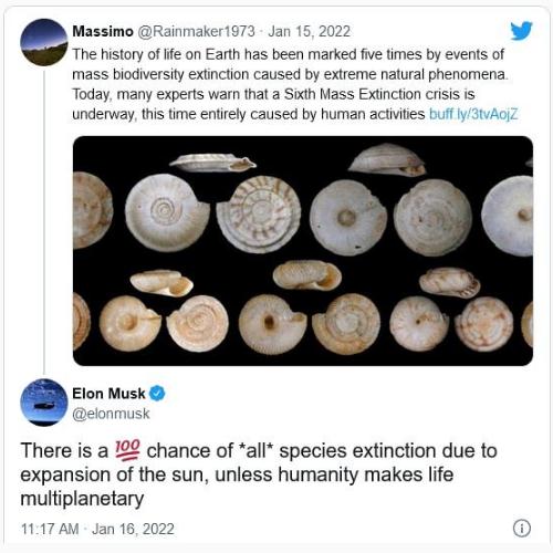據外媒報道,電動汽車制造商特斯拉和美國太空探索技術公司 SpaceX 首席執行官埃隆·馬斯克(Elon Musk)周一在推特上表示,太陽膨脹可能會導致地球上所有物種滅絕,包括人類。只有讓生命多行星化,才可以避免這種命運。