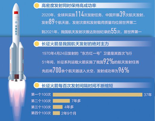 中國航天科技集團一院長征系列運載火箭高級顧問龍樂豪院士說,長征系列火箭400次發射中,實現第一個100次發射用時37年;第二個100次發射用時7年多;第三個100次發射用時4年多;第四個100次發射僅用了2年9個月。