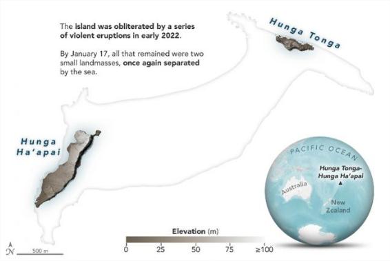 NASA 地球觀測站的數(shù)字高程地圖也顯示了洪阿哈阿帕伊島發(fā)生的劇烈變化。在本月早些時候火山噴發(fā)前,兩個無人居住的島嶼被火山錐合并成一個新陸地。