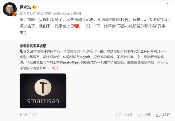 1 月 20 日凌晨,羅永浩在微博上轉(zhuǎn)發(fā)網(wǎng)友評(píng)論,并且再次預(yù)告自己年后將回歸科技界。