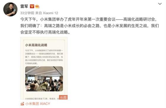 今天下午,小米集團舉行了虎年開年來第一次重要會議--高端化戰略研討會,我們明確了:高端之路是小米成長的必由之路,也是小米發展的生死之戰,我們會堅定不移執行高端化戰略。