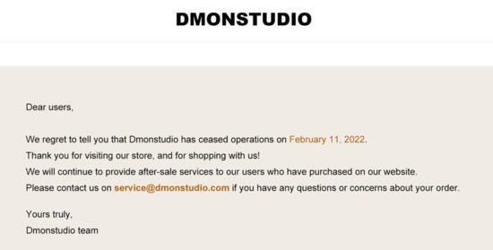 Dmonstudio網(wǎng)站主頁(yè)刊登的致消費(fèi)者的公告顯示,Dmonstudio已于2022年2月11日停止運(yùn)營(yíng),但已經(jīng)在網(wǎng)站上購(gòu)買了商品的消費(fèi)者,可以繼續(xù)享受售后服務(wù)。如果消費(fèi)者對(duì)訂單有任何疑問(wèn),都可以通過(guò)郵件聯(lián)系到Dmonstudio團(tuán)隊(duì)。
