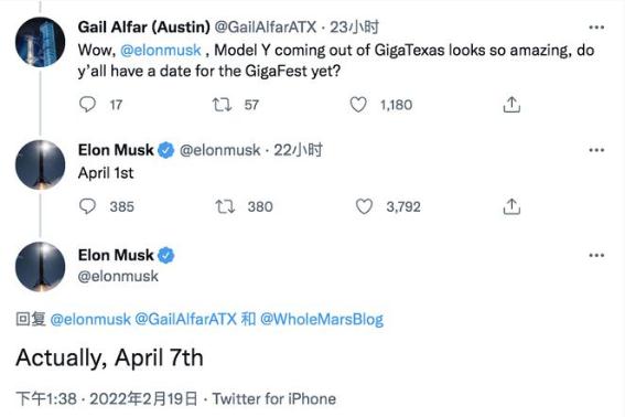 馬斯克在個人社交媒體 Twitter 上確認,這次活動將于 4 月 7 日舉行。最初馬斯克表示活動將于 4 月 1 日舉行。馬斯克可能很快意識到當天是愚人節,為了避免任何不必要的誤會,所以又把德克薩斯州超級工廠的慶祝活動推遲了六天,以避免任何潛在的混亂。