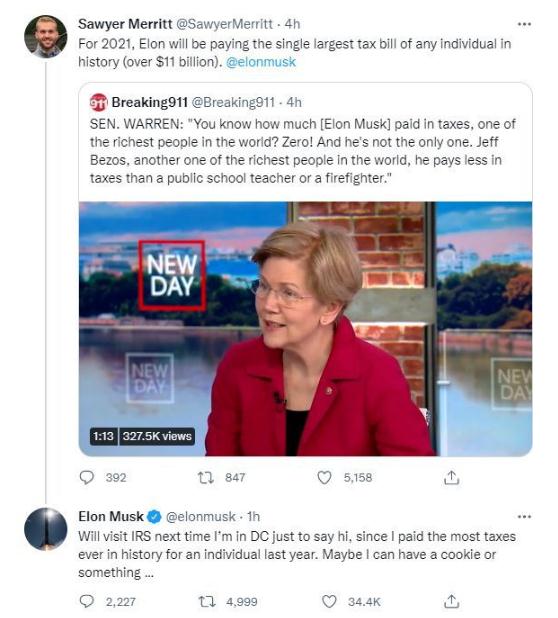 有網(wǎng)友在Twitter上發(fā)文表示,馬斯克在2021年繳稅超110億美元,創(chuàng)造歷史新高。