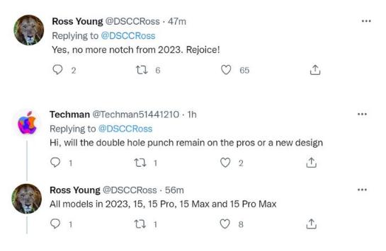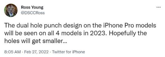 顯示器行業分析師Ross Young通過Twitter表示,iPhone Pro機型的“雙打孔”設計將在2023年的4款機型上全部出現。