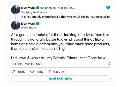 馬斯克很喜歡在推特上就投資發表推文。例如,去年年底,馬斯克開啟特斯拉減持操作,從11月到12月,他出售的特斯拉股票總額已超過150億美元。現在回顧,這一點位相當精準。特斯拉股價在11~12月價格處于886~1243美元區間,其中1243美元是其歷史高點。而自那之后,股價伴隨美股大盤一路下跌,到本周一僅有760美元。去年初,他也因為入場數字貨幣,轟動幣圈。