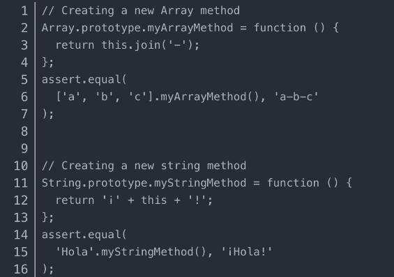 在 JavaScript 中,我們可以通過改變其原型來為內置值添加方法: