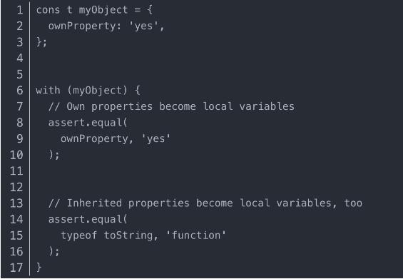 長期以來,人們一直不鼓勵使用 JavaScript 的 with 語句,甚至在 ES5 中引入的嚴格模式中也被定為非法。在其他地方,嚴格模式在 ECMAScript 模塊中是活躍的。