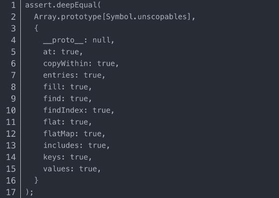 公共符號Symbol.unscopables 允許對象隱藏語句中的某些屬性。它只在標準庫中使用一次,對于 Array.prototype:with