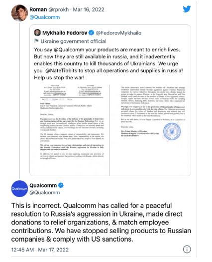 高通負責政府事務的高級副總裁內(nèi)特?提比茨 (Nate Tibbits) 在 Twitter 上披露了這一舉措,他是在回應烏克蘭副總理米哈伊洛?費多羅夫 (Mykhailo Fedorov) 的評論。