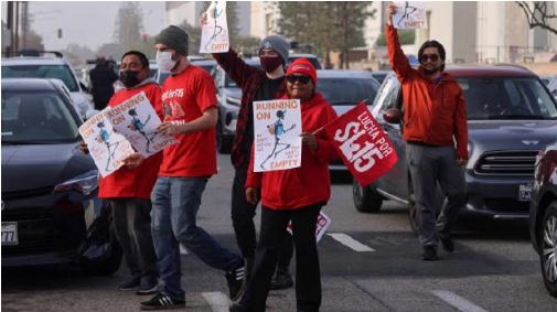 周三早上,大約 50 名配送、拼車司機聚集在洛杉磯附近亞馬遜倉庫外,他們要求亞馬遜為油價上漲提供補貼。