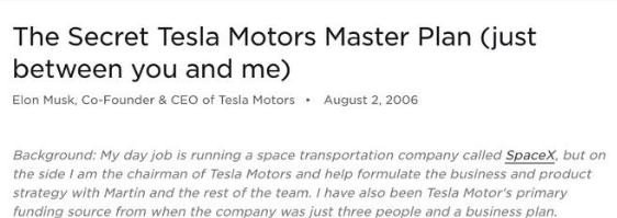 2006 年 8 月 2 日,馬斯克首次公布了其“秘密宏圖”,他在博文《特斯拉汽車的秘密宏圖(不要告訴別人)》中,介紹了特斯拉的四步計(jì)劃: