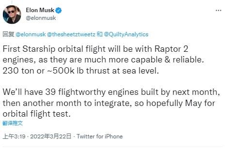 馬斯克在推特上表示:“到下個(gè)月,我們將制造出 39 個(gè)飛行引擎,然后再花一個(gè)月進(jìn)行整合,有望在 5 月份能進(jìn)行軌道飛行測(cè)試。”