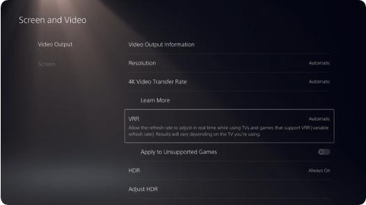 索尼表示,之前推出的 PS5 游戲將針對 VRR 進行優化,未來的游戲則可能在推出時就支持 VRR。用戶也可選擇將 VRR 套用至不支持該功能的 PS5 游戲,但可能效果會差一些,用戶可手動選擇開啟。