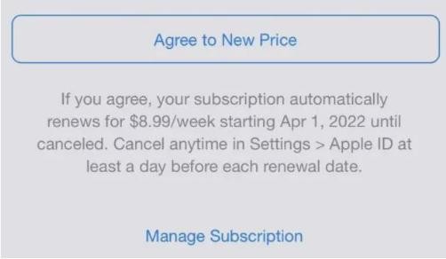 援引科技媒體 TechCrunch 報(bào)道,蘋(píng)果似乎正在測(cè)試一項(xiàng)新功能,允許開(kāi)發(fā)者在訂閱價(jià)格上調(diào)后自動(dòng)向用戶收費(fèi)。當(dāng)前,當(dāng)訂閱費(fèi)用上調(diào)的時(shí)候,蘋(píng)果要求需要獲得用戶的明確同意。如果客戶不點(diǎn)擊呈現(xiàn)的“同意新價(jià)格”按鈕,他們的訂閱會(huì)被自動(dòng)取消。