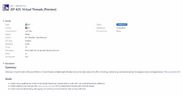 有關虛擬線程的更多信息可在 OpenJDK 的 JDK Issue-8277131 中查看,目前該提案于 2021/11/15 創立,目前還處于 JEP 流程的第一階段,距離穩定版本還需要一段時間。