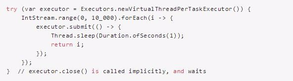 開發者可以選擇使用虛擬線程還是平臺線程,但虛擬線程在高吞吐量的服務器應用程序中表現更好。比如下面這段休眠一秒鐘的代碼就創建了大量的虛擬線程,程序首先獲得一個 ExecutorService,它為每個提交的任務創建一個新的虛擬線程,然后提交 10000 個任務并等待所有任務完成: