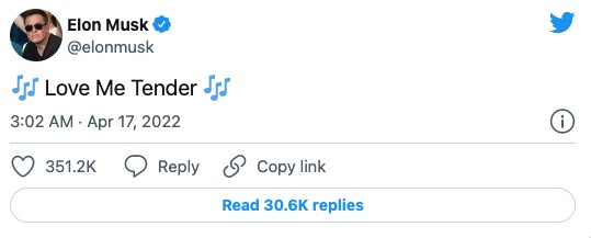 上周,馬斯克提出以每股 54.20 美元、總價值 430 億美元收購 Twitter,引發(fā)轟動,導致 Twitter 在上周五采用了一項所謂的“毒丸防御計劃”,讓馬斯克或一群投資者更難獲得更多股票。如果 Twitter 的董事們最終拒絕了他,全世界就會知道馬斯克這條推文是否是在真的威脅要直接吸引股東,還是剛剛把 1956 年“貓王”埃爾維斯?普雷斯利 (Elvis Presley) 的熱門歌曲《溫柔地愛我》(Love Me Tender) 加入了他的播放列表。