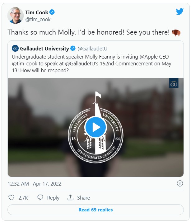 蘋果公司首席執(zhí)行官蒂姆-庫(kù)克已經(jīng)同意在加拉德特大學(xué)的畢業(yè)典禮上發(fā)表演講,加拉德特大學(xué)是一所專門教授聾人、聾盲人和聽障學(xué)生的教育機(jī)構(gòu)。