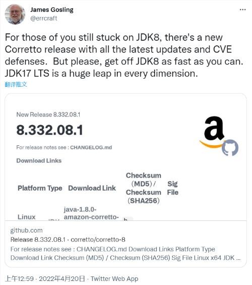 不過醉翁之意不在酒,原來 Java 之父只是為了給東家 AWS 的 OpenJDK 發行版 Corretto “帶貨”,他建議仍在使用 JDK 8 的開發者可以考慮使用 Corretto 的新版本——包含了所有最新的更新和 CVE 防御。