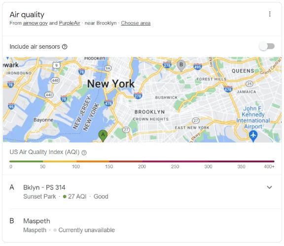 谷歌首先在印度發(fā)布了該功能(現(xiàn)在也可以在澳大利亞維多利亞州使用),現(xiàn)在正在通過(guò) airnow.gov 和 PurpleAir 的幫助將其帶到美國(guó)的搜索服務(wù)中。移動(dòng)端和桌面端網(wǎng)絡(luò)用戶(hù)可以輸入他們想查詢(xún)的美國(guó)城市,搜索會(huì)提供指定位置的信息。用戶(hù)可以輸入“波士頓的空氣質(zhì)量”或“布魯克林的空氣質(zhì)量”。例如,截至撰寫(xiě)本文時(shí),布魯克林市的 AQI 為 27,空氣質(zhì)量?jī)?yōu)良。