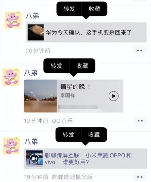 像公眾號推文、歌曲、視頻分享等等,都支持轉發功能。