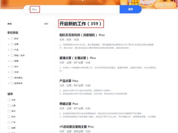 除了內(nèi)部轉(zhuǎn)崗,委派自己人掌控大局,Pico 社交中心也在積極對(duì)外選賢舉能。在字節(jié)跳動(dòng)的招聘官網(wǎng)上,Pico 目前開放的招聘崗位多達(dá) 359,囊括了服務(wù)端開發(fā)工程師、音視頻編碼高級(jí)工程師、VR 視頻體驗(yàn)設(shè)計(jì)、Unity3D 架構(gòu)師、圖像算法工程師、傳感器算法專家等各個(gè)崗位,分布地區(qū)包括北京、上海、深圳等。