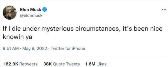 “如果我神秘地死亡,很高興認(rèn)識你。” 馬斯克在推特上寫道,但并未對此作詳細(xì)說明。