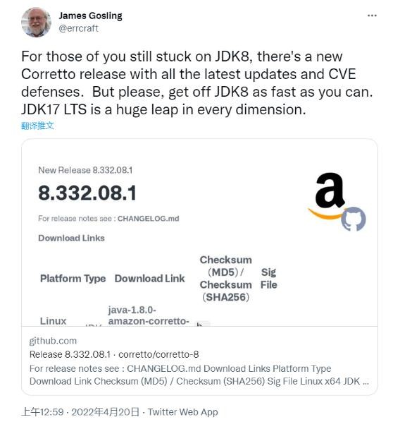 不過醉翁之意不在酒,原來 Java 之父只是為了給東家 AWS 的 OpenJDK 發行版 Corretto “帶貨”,他建議仍在使用 JDK 8 的開發者可以考慮使用 Corretto 的新版本——包含了所有最新的更新和 CVE 防御。Corretto 是亞馬遜推出的 OpenJDK 8 的發行版,它支持多種平臺,可以在云端與本地計算機上運行。每個 Corretto 版本上都會運行技術兼容性工具包(Technology Compatibility Kit,TCK),以確保與 Java SE 平臺相兼容。在不使用到 OpenJDK 中沒有的功能(例如 Java Flight Recorder)的情況下,Corretto 完全可以直接作為 Java SE 發行版的替代品。