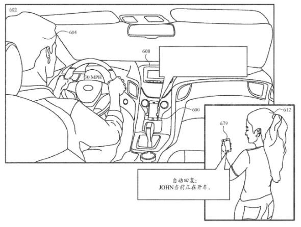 從專利圖可以看到,當(dāng)用戶在開(kāi)車(chē)時(shí),iPhone 手機(jī)將自動(dòng)回復(fù)“JOHN(用戶名稱)當(dāng)前正在開(kāi)車(chē)”,似乎會(huì)檢測(cè)用戶的車(chē)速,從而自動(dòng)開(kāi)啟該功能。