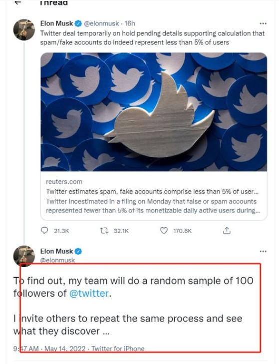 特斯拉 CEO 埃隆·馬斯克在其 13 日宣布擱置收購?fù)铺氐耐莆南路窖a(bǔ)充稱:為了找到答案,將隨機(jī)抽取 100 名推特粉絲。同時(shí)還會(huì)邀請(qǐng)其他人進(jìn)行同樣的操作,看看他們會(huì)發(fā)現(xiàn)什么。