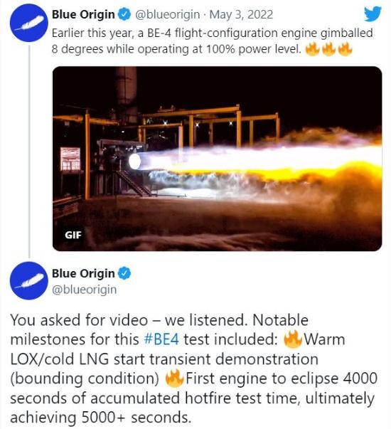 貝索斯的藍色起源成功測試了 100% 推力的 BE-4 火箭發動機,能夠達到 550000lbf 的推力。
