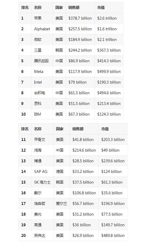 微軟(2.1 萬億美元)位居第三,騰訊(4143 億美元)穩(wěn)居前五。Facebook 改名的 Meta(4999 億美元)排名第六,其次是英特爾(1903 億美元)、臺積電(4946 億美元)、思科(2134 億美元)和 IBM(1243 億美元)。