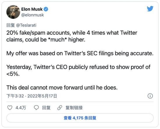 當(dāng)?shù)貢r間 5 月 17 日,馬斯克在推特上發(fā)文稱,除非推特提供證據(jù)證明其虛假用戶數(shù)量的比例,否則“這筆交易無法推進(jìn)”。