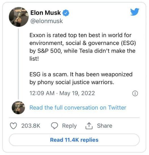 在特斯拉被踢出標普 ESG 指數成份股后,馬斯克在推特上表示,ESG 就是“一個騙局”。他抱怨稱,“埃克森美孚都被標普 500 評為全球環境、社會和治理(ESG)前十,而特斯拉竟然沒有上榜!”