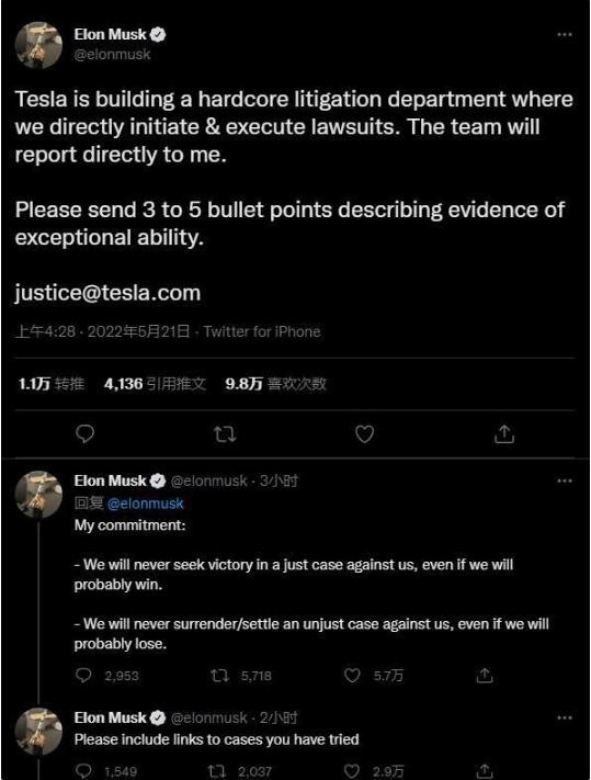 馬斯克在推特上宣布:“特斯拉正在組建核心訴訟部門,我們將直接發(fā)起和執(zhí)行訴訟。這個團隊將直接向我匯報工作。”