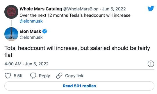 一個未經驗證的推特賬戶發文稱,特斯拉的員工人數將在未來 12 個月增加。馬斯克隨后在下面回復稱:“員工總量將增加,但受薪員工人數應該相當平穩。”
