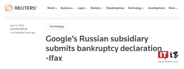 據路透社報道,今日,俄羅斯國際文傳電訊社援引法庭在線文件稱,Alphabet 旗下谷歌的俄羅斯子公司已提交破產聲明。