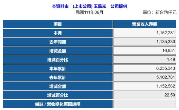 7 月 7 日,玉晶光披露了公司 2022 年 6 月的營收情況。公告顯示,玉晶光當(dāng)月實(shí)現(xiàn)營收 11.52 億元新臺幣,月增 42.53%,年增 1.49%;該公司上半年實(shí)現(xiàn)營收合計(jì) 62.55 億元新臺幣,與去年同期相比增長 22.59%。