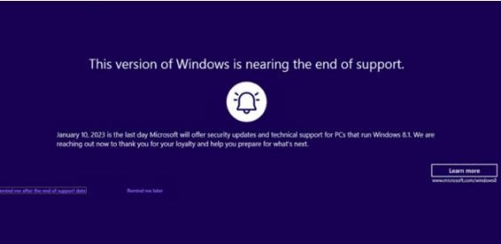 據(jù)相關(guān)用戶反饋,已經(jīng)收到微軟推送的彈窗警告,提醒官方對 Windows 8.1 系統(tǒng)的安全補丁和技術(shù)支持將在 2023 年 1 月 10 日結(jié)束。微軟給了用戶三個選擇,可以選擇了解更多信息、稍后提醒或在結(jié)束支持時提醒。