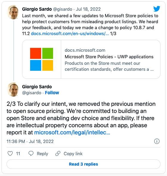 在原本的生效日期(7 月 16 日)后兩天,Giorgio Sardo 在推特上再次出面表示,已經對應用商店政策做了優化,即刪除了第 10.8.7 節中提到的開放源代碼定價條款,同時,為了強調微軟的實際意圖,在第 11.2 節中添加了指向微軟在線侵權報告表的鏈接。“我們致力于建立一個開放的商店,讓開發者有足夠的選擇和靈活性。微軟商店里有很多很棒的免費和付費 OSS 應用,我們期待并歡迎更多項目加入。”