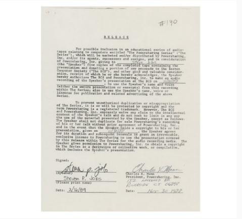 拍品還包括了當(dāng)年喬布斯為 Powersharing 系列和早期 NeXT 計算機會議錄制的音頻,還包括計算機手冊和 Apple Newton MessagePad 等物品,但其中更獨特的是由喬布斯、Apple 聯(lián)合創(chuàng)始人 Steve Wozniak(史蒂夫·沃茲尼亞克)和許多其他人簽名的一系列文件、新聞稿等。這些文件包括參與 Powersharing 系列期間,眾多技術(shù)先驅(qū)簽署發(fā)布的表格包括比爾·蓋茨、埃斯特·戴森、皮克斯聯(lián)合創(chuàng)始人阿爾維·雷·史密斯、蘋果前首席執(zhí)行官約翰·斯卡利等。