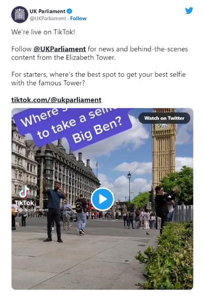 ▲ 7 月 27 日,英國議會在推特上宣布,已在 TikTok 上發布第一條視頻
