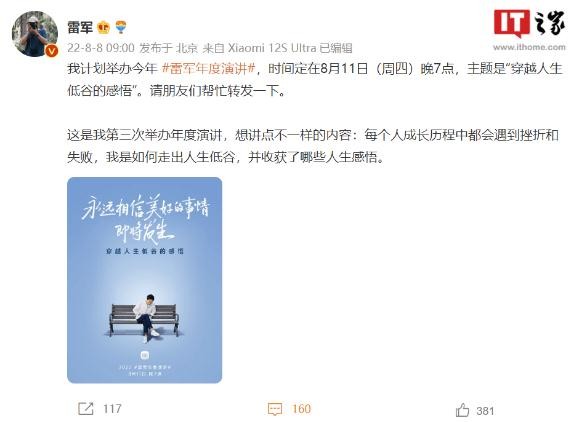 小米創辦人、董事長兼 CEO 雷軍通過社交媒體表示,計劃舉辦今年雷軍年度演講,時間定在 8 月 11 日(周四)晚 7 點,主題是“穿越人生低谷的感悟”。雷軍表示,這是他第三次舉辦年度演講,想講點不一樣的內容,“每個人成長歷程中都會遇到挫折和失敗,我是如何走出人生低谷,并收獲了哪些人生感悟。”