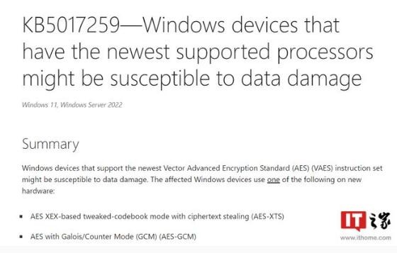 微軟稱,受影響的系統搭載了支持最新 Vector Advanced Encryption Standard (VAES) 指令集的處理器,具體來說,包括英特爾 10 代酷睿(Ice Lake)和第三代至強可擴展處理器(IceLake-SP),以及 AMDZen 4 架構處理器。