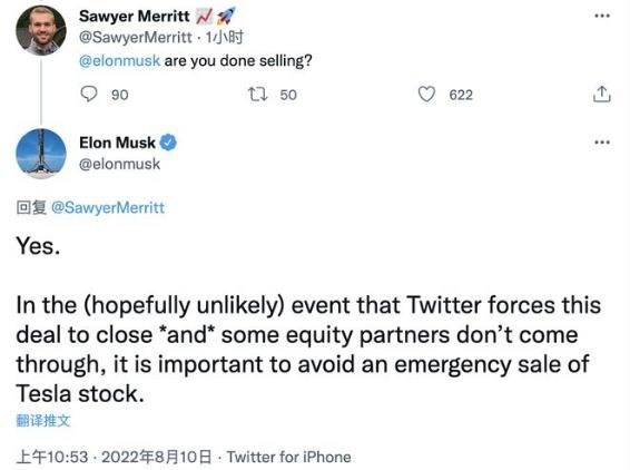 這封信發(fā)出之際,8 月 10 日,馬斯克在推特上對(duì)當(dāng)?shù)貢r(shí)間 8 月 5 日到 8 月 9 日之間出售價(jià)值 69 億美元的特斯拉股票作出回應(yīng),表示本次出售已暫告一段落。同時(shí),他還提到,本次減持與推特收購(gòu)案相關(guān),是為了避免被強(qiáng)制執(zhí)行收購(gòu)后緊急拋售特斯拉股票以獲取資金。
