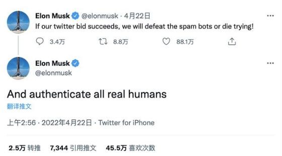 推特平臺的虛假賬戶一直是馬斯克的“心頭大患”。在推特同意被收購之前,馬斯克就曾大張旗鼓地表示,想在推特推行實名制。4 月 22 日他發(fā)布推文稱,“如果能夠成功收購?fù)铺兀瑢⒋驌羲械臋C器人賬號,驗證所有的真人賬號。”