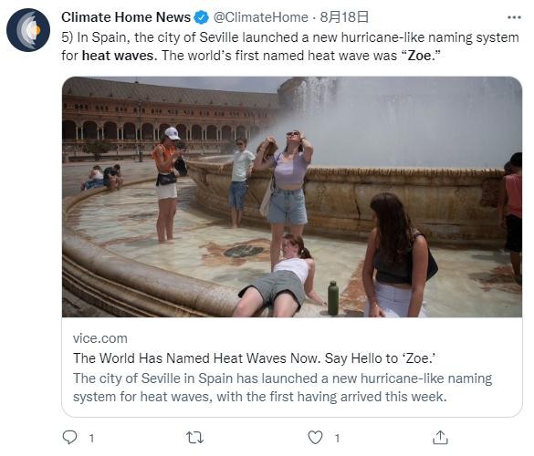 今年 7 月 24 日至 27 日期間西班牙塞維利亞氣溫飆升至 112 華氏度 (44.4 攝氏度),科學家將這股熱浪命名為“佐伊”(Zoe)。這也是科學家首次為熱浪命名。
